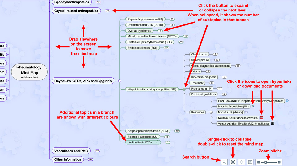- The map is organised like medical textbooks, with rheumatic conditions and subtopics listed alphabetically or in the same order as other educational sources.